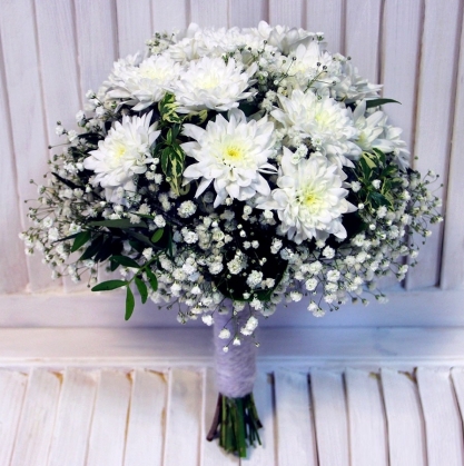 Очень красивый и простой букет невесты из кустовых хризантем и гипсофилы с добавлением фисташки. Бутоньерка и пакет лепестков в подарок!